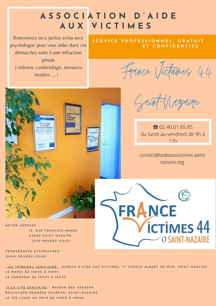 – au Bureau d’Aide aux Victimes au Tribunal Judiciaire 77 avenue Albert de Mun 44600 Saint-Nazaire