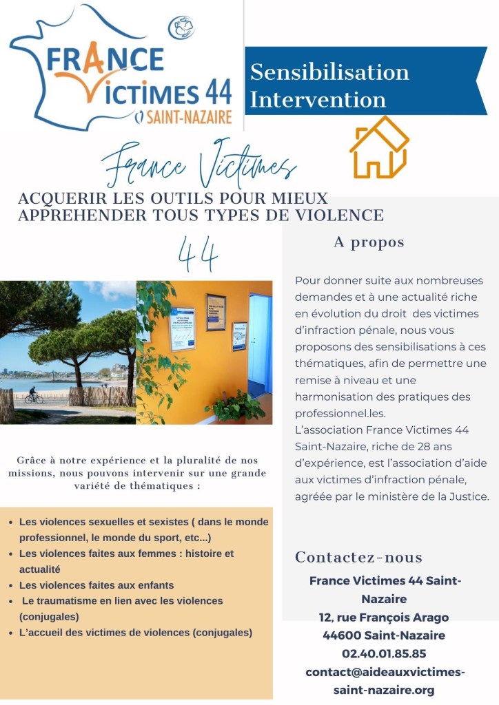L’association France Victimes 44 Saint Nazaire, riche de 28 ans d’expérience, est l’association d’aide aux victimes d’infraction pénale, agréée par le ministère de la Justice.